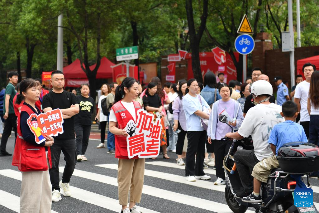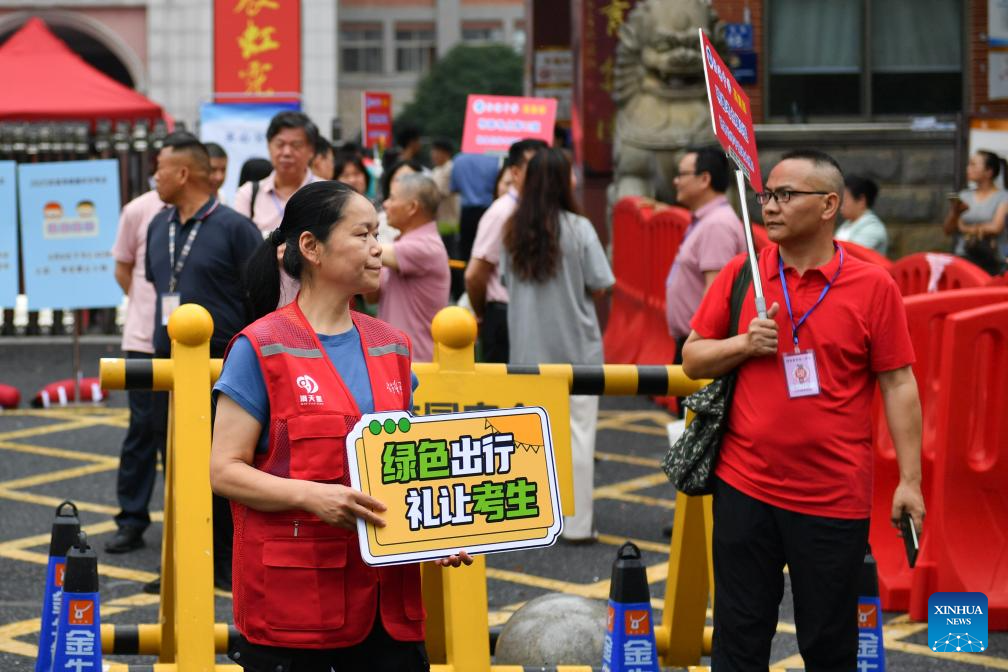 Volunteers maintain order outside a national college entrance examination site in Changsha, central China's Hunan Province, June 8, 2025. Tianxin District of Changsha has organised volunteers to provide help for students and their parents at multiple local examination sites during this year's national college entrance exam. (Xinhua/Chen Zhenhai)