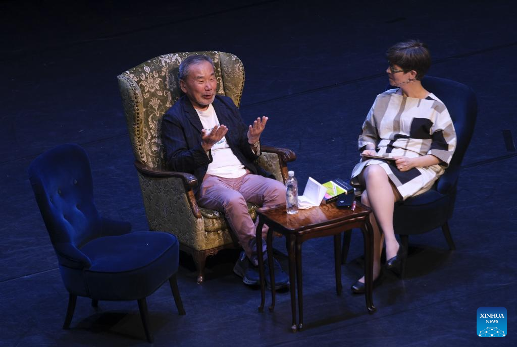 Japanese author Haruki Murakami (C) speaks during an event at the 2025 Norwegian Festival of Literature in Lillehammer, Norway, on June 7, 2025. The 2025 Norwegian Festival of Literature, the largest literary festival in the Nordic region, concluded on Sunday after a week of vibrant events that drew tens of thousands of visitors and featured acclaimed authors from across the globe. (Photo by Chen Yaqin/Xinhua)