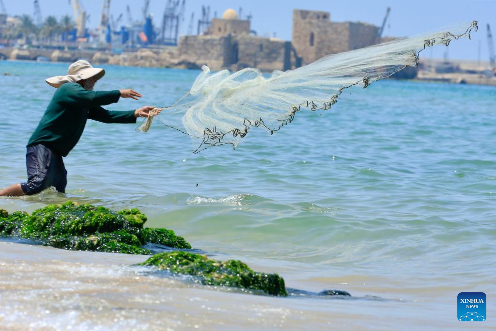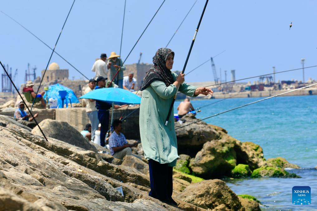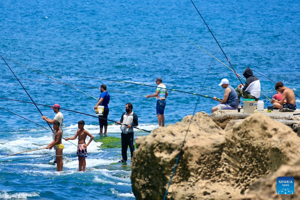 Citizens enjoy fishing during the Eid al-Adha holiday on the beach in Sidon, Lebanon, on June 7, 2025. (Photo by Ali Hashisho/Xinhua)