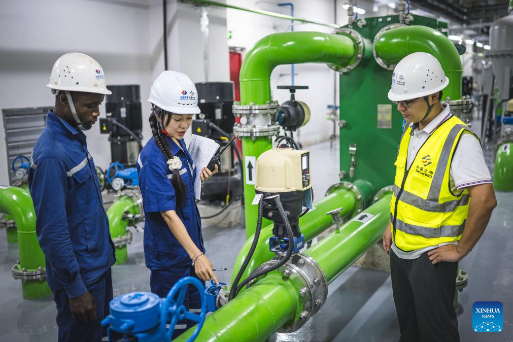 Hou Bing (2nd R), chief engineer of the Gribo-Popoli Hydroelectric Power Plant, monitors the operation of the power plant with local technicians in Soubre, Cote d'Ivoire, May 29, 2025. (Xinhua/Wang Guansen)