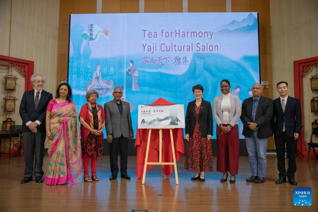 Mauritian President Dharam Gokhool (3rd L) tries tea during a cultural event "Tea for Harmony: Yaji Cultural Salon" in Port Louis, Mauritius, June 7, 2025. (China Cultural Center in Mauritius/Handout via Xinhua)