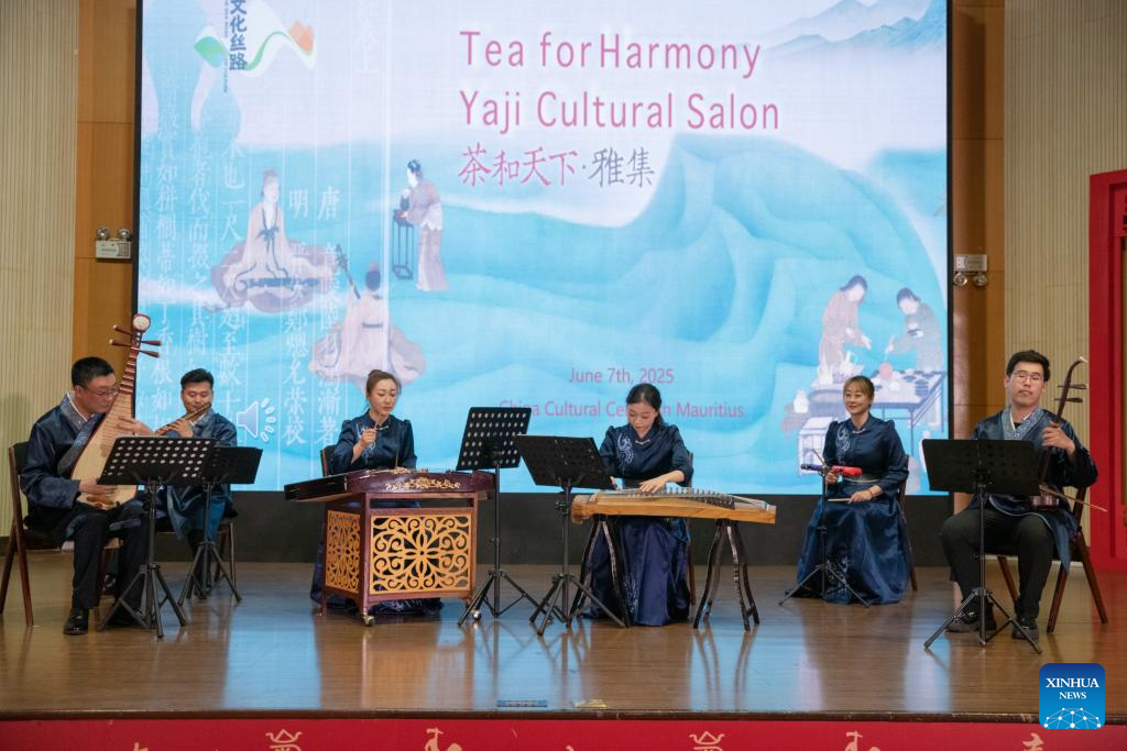 Performers from Minzu University of China perform Chinese folk music during a cultural event "Tea for Harmony: Yaji Cultural Salon" in Port Louis, Mauritius, June 7, 2025. (China Cultural Center in Mauritius/Handout via Xinhua)