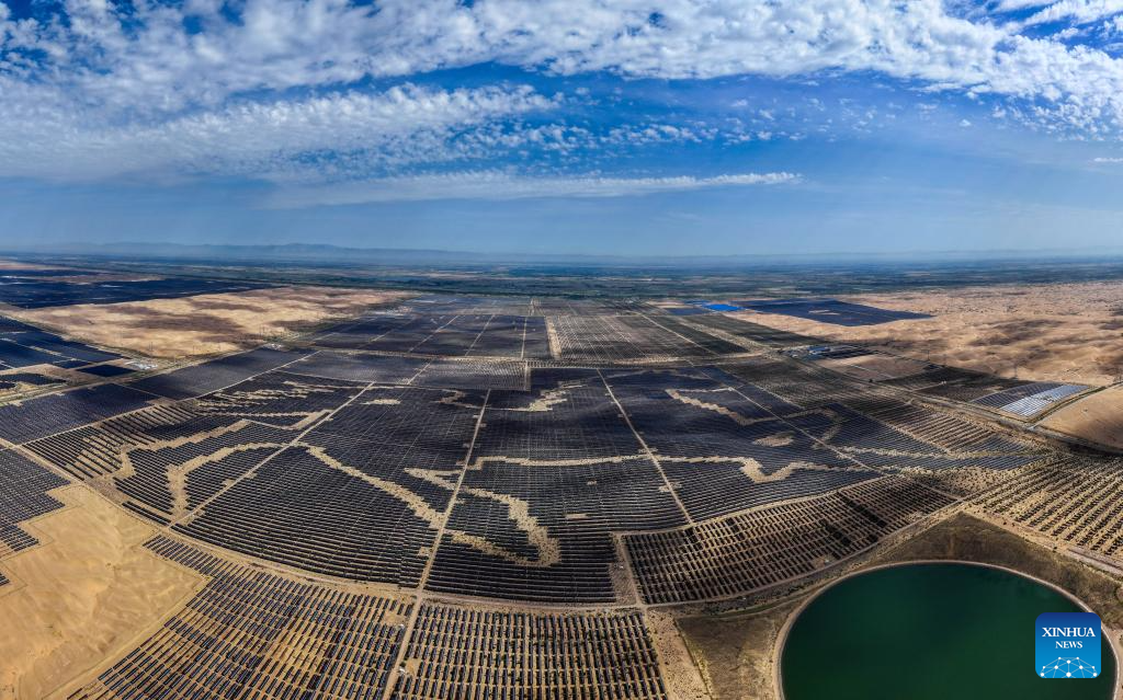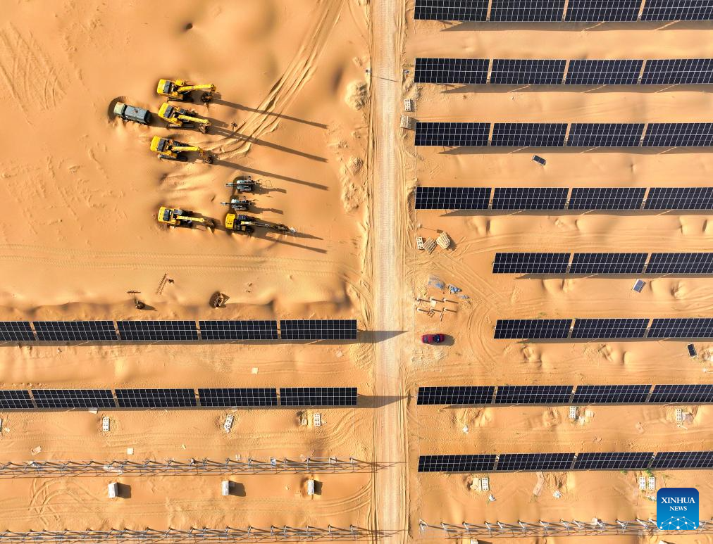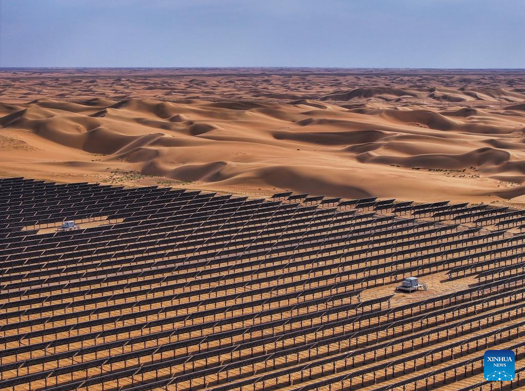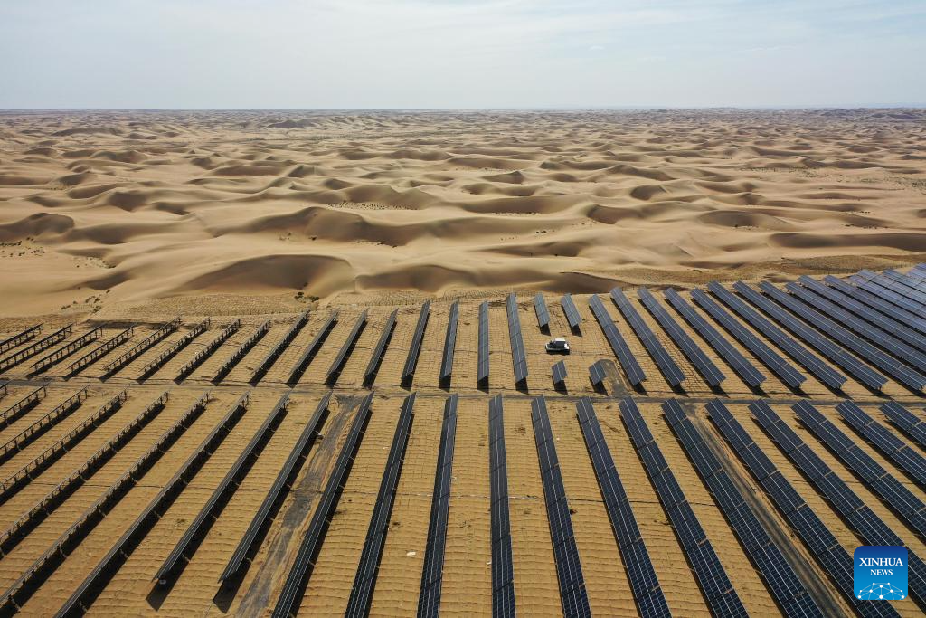 In deserts of Kubuqi and Ulan Buh, the sand control model with photovoltaic projects has been widely implemented, transforming stretches of sandy terrain into vast "blue seas" brimming with green energy. (Xinhua/Lian Zhen)