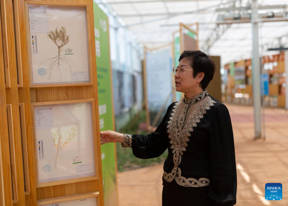 A staff member introduces desert plant specimens at an integrated sand control and photovoltaic project at a state forestry area in the edge of Ulan Buh Desert in Linhe District of Bayannur, north China's Inner Mongolia Autonomous Region, June 5, 2025. In recent years, Inner Mongolia has made all-out efforts to tackle the ecological challenges in the areas along the Yellow River, and has treated land covering a total of 14.89 million mu (about 992,667 hectares).