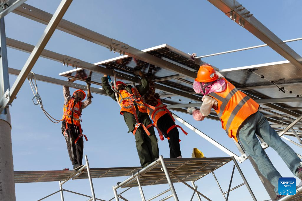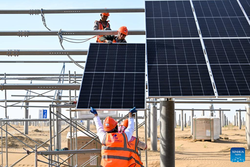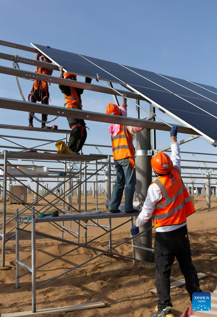 Workers install photovoltaic panels at a photovoltaic project in Kubuqi Desert, north China's Inner Mongolia Autonomous Region, June 6, 2025. In recent years, Inner Mongolia has made all-out efforts to tackle the ecological challenges in the areas along the Yellow River, and has treated land covering a total of 14.89 million mu (about 992,667 hectares).
