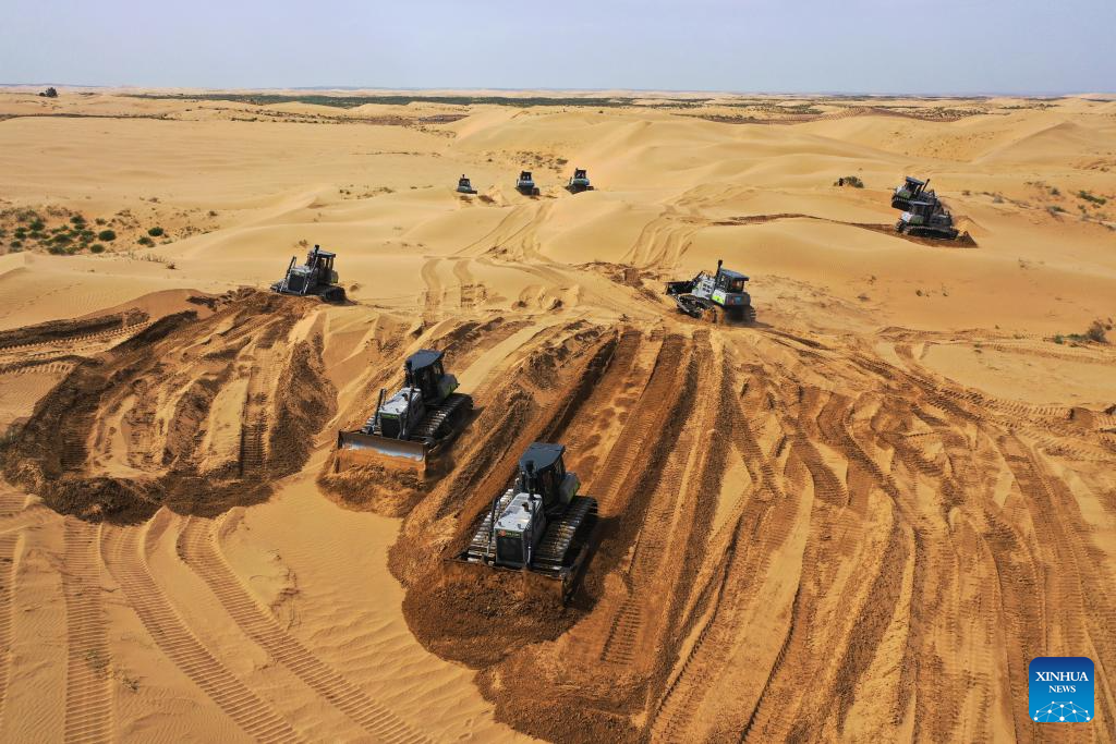 An aerial drone photo taken on June 7, 2025 shows machineries leveling sandy land for the construction of a photovoltaic project in Kubuqi Desert in Dalad Banner of north China's Inner Mongolia Autonomous Region. In recent years, Inner Mongolia has made all-out efforts to tackle the ecological challenges in the areas along the Yellow River, and has treated land covering a total of 14.89 million mu (about 992,667 hectares).