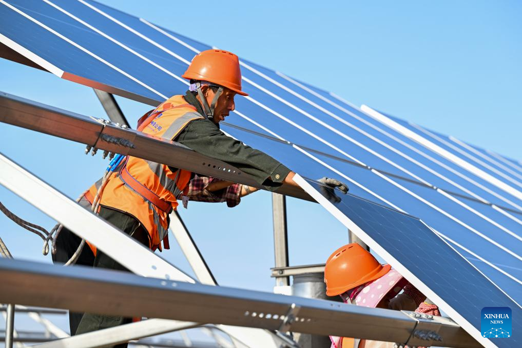 A worker installs photovoltaic panels at a photovoltaic project in Kubuqi Desert, north China's Inner Mongolia Autonomous Region, June 6, 2025. In recent years, Inner Mongolia has made all-out efforts to tackle the ecological challenges in the areas along the Yellow River, and has treated land covering a total of 14.89 million mu (about 992,667 hectares).