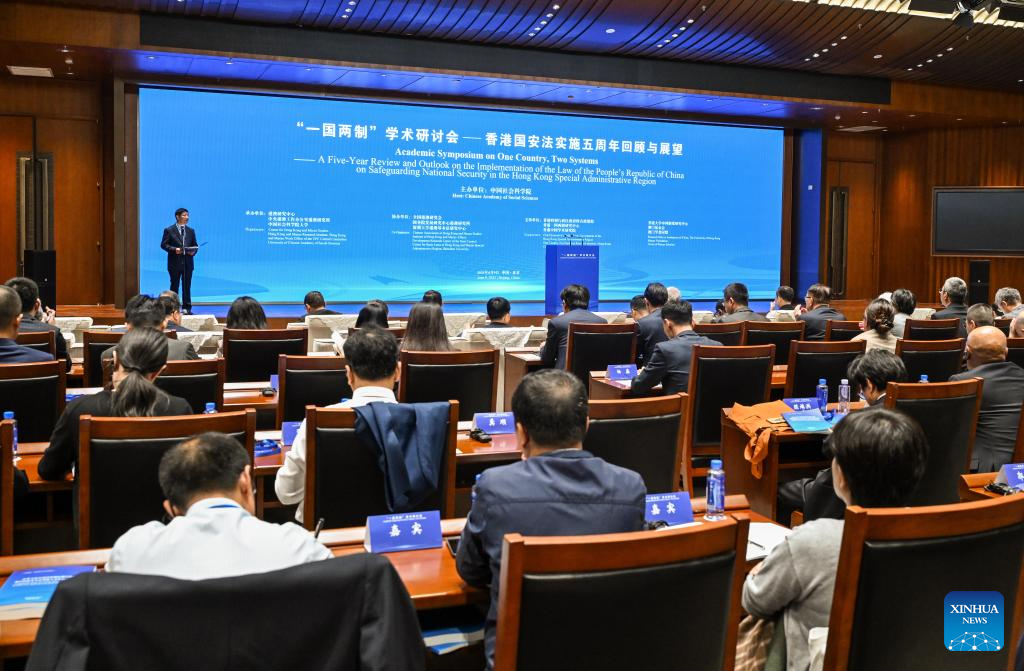 BEIJING, June 9 (Xinhua) -- An academic symposium on "one country, two systems" was held in Beijing on Monday, focusing on a five-year review and outlook on the implementation of the Hong Kong national security law.