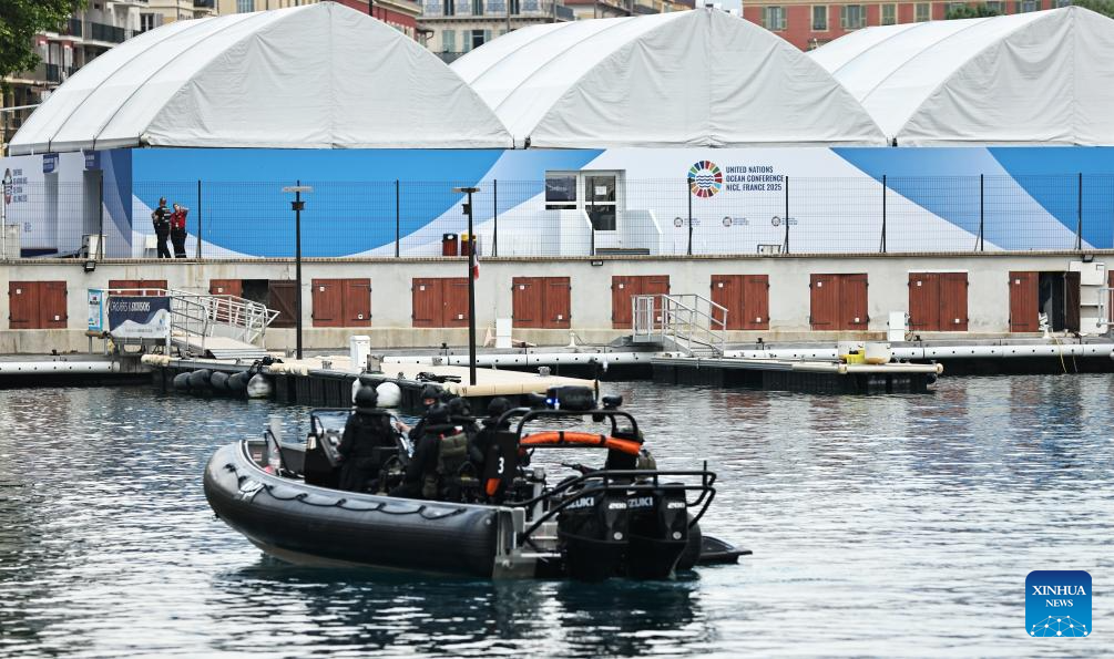 Policemen patrol outside the main venue for the third United Nations Ocean Conference (UNOC3) in Nice, France, June 9, 2025. The third United Nations Ocean Conference (UNOC3) opened on Monday in Nice, a coastal city in southern France, under the theme of "Accelerating action and mobilizing all actors to conserve and sustainably use the ocean". (Xinhua/Gao Jing)
