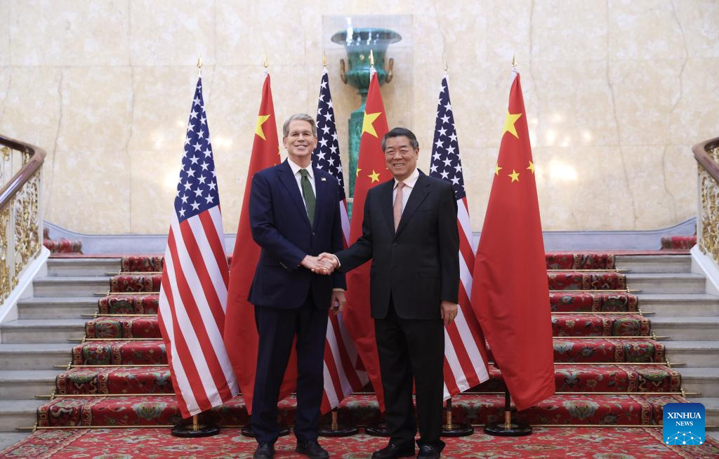 Chinese Vice Premier He Lifeng, also a member of the Political Bureau of the Communist Party of China Central Committee, shakes hands with U.S. Treasury Secretary Scott Bessent prior to the first meeting of the China-U.S. economic and trade consultation mechanism in London, Britain, June 9, 2025. The meeting opened here on Monday. He Lifeng attended the meeting with U.S. representatives. (Xinhua/Li Ying)