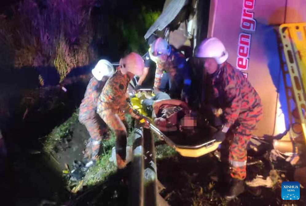 This image provided by the Fire and Rescue Department of Malaysia shows rescuers working at the site of a bus crash on the East-West Highway near the town of Gerik, Malaysia, June 9, 2025. At least 15 people were killed in the bus crash, according to Bernama. (Fire and Rescue Department of Malaysia/Handout via Xinhua)