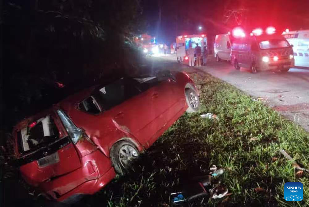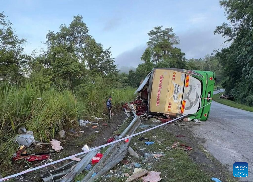 This image provided by the Fire and Rescue Department of Malaysia shows the site of a bus crash on the East-West Highway near the town of Gerik, Malaysia, June 9, 2025. At least 15 people were killed in the bus crash, according to Bernama. (Fire and Rescue Department of Malaysia/Handout via Xinhua)