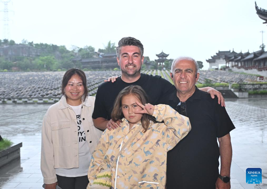 Burak Anbar (C, rear) poses for photos with his family at a soy sauce factory in Hejiang County, Luzhou City, southwest China's Sichuan Province, May 28, 2025. (Xinhua/Liu Kun)