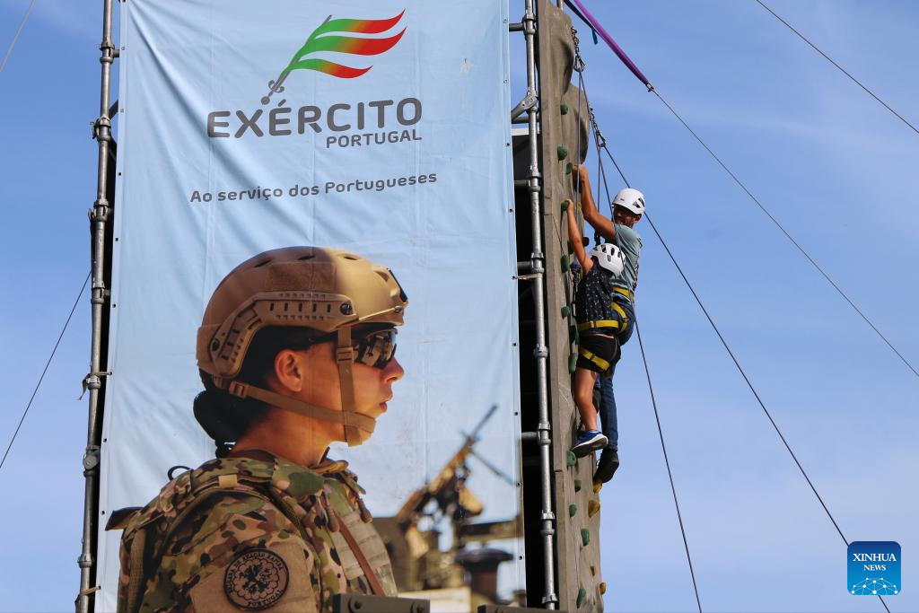 People attend a climbing activity in Lagos, Portugal, June 8, 2025. Portugal will hold its National Day military parade on June 10 in the southern coastal city of Lagos. On June 8, the armed forces organized an open day event, featuring exhibition booths and inviting the public to interact with soldiers and various types of military equipment. (Xinhua/Xun Wei)
