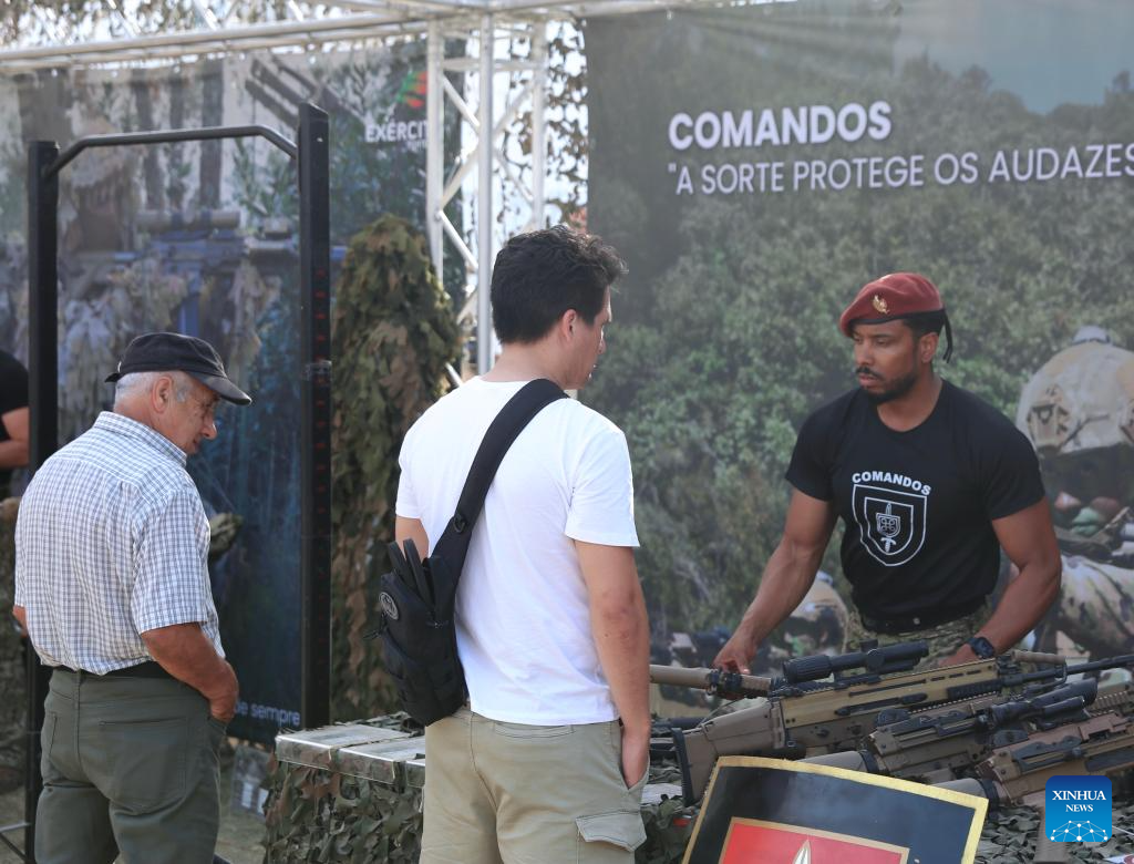 A soldier explains firearms to visitors in Lagos, Portugal, June 8, 2025. Portugal will hold its National Day military parade on June 10 in the southern coastal city of Lagos. On June 8, the armed forces organized an open day event, featuring exhibition booths and inviting the public to interact with soldiers and various types of military equipment. (Xinhua/Xun Wei)