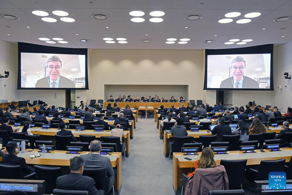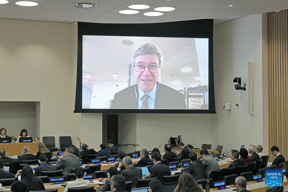 U.S. economist Jeffrey Sachs (on the screen), speaks via video link during a UN event to mark the first anniversary of the International Day for Dialogue Among Civilizations at the UN headquarters in New York, June 9, 2025. (Xinhua/Li Rui)