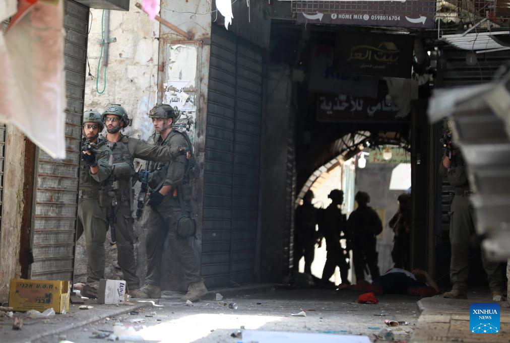 Members of Israeli forces carry out an operation in the West Bank city of Nablus, on June 10, 2025. A Palestinian man was killed and another injured on Tuesday during an Israeli army raid in the Old City of Nablus in the northern West Bank, according to a Palestinian official. (Photo by Ayman Nobani/Xinhua)
