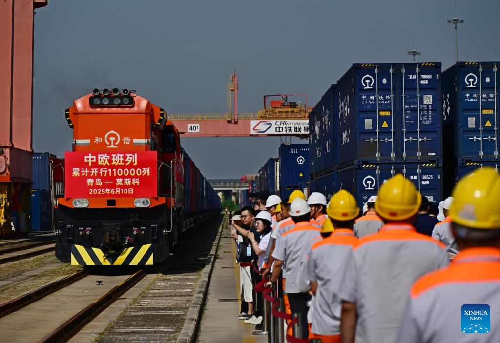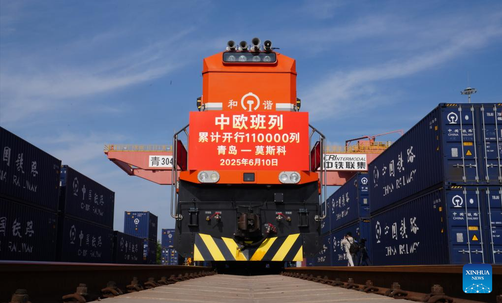 This photo shows the 110,000th China-Europe freight train bound for Moscow of Russia, departing from Jiaozhou Railway Station in Qingdao, east China's Shandong Province, June 10, 2025. The 110,000th China-Europe freight train departed from Qingdao on Tuesday morning, marking a milestone in the service's high-quality development.