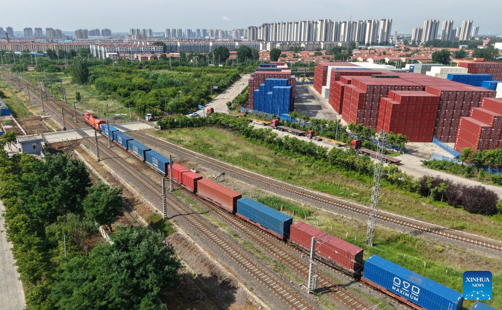 An aerial drone photo shows the 110,000th China-Europe freight train departing from Jiaozhou Railway Station in Qingdao, east China's Shandong Province, June 10, 2025. The 110,000th China-Europe freight train departed from Qingdao on Tuesday morning, marking a milestone in the service's high-quality development.
