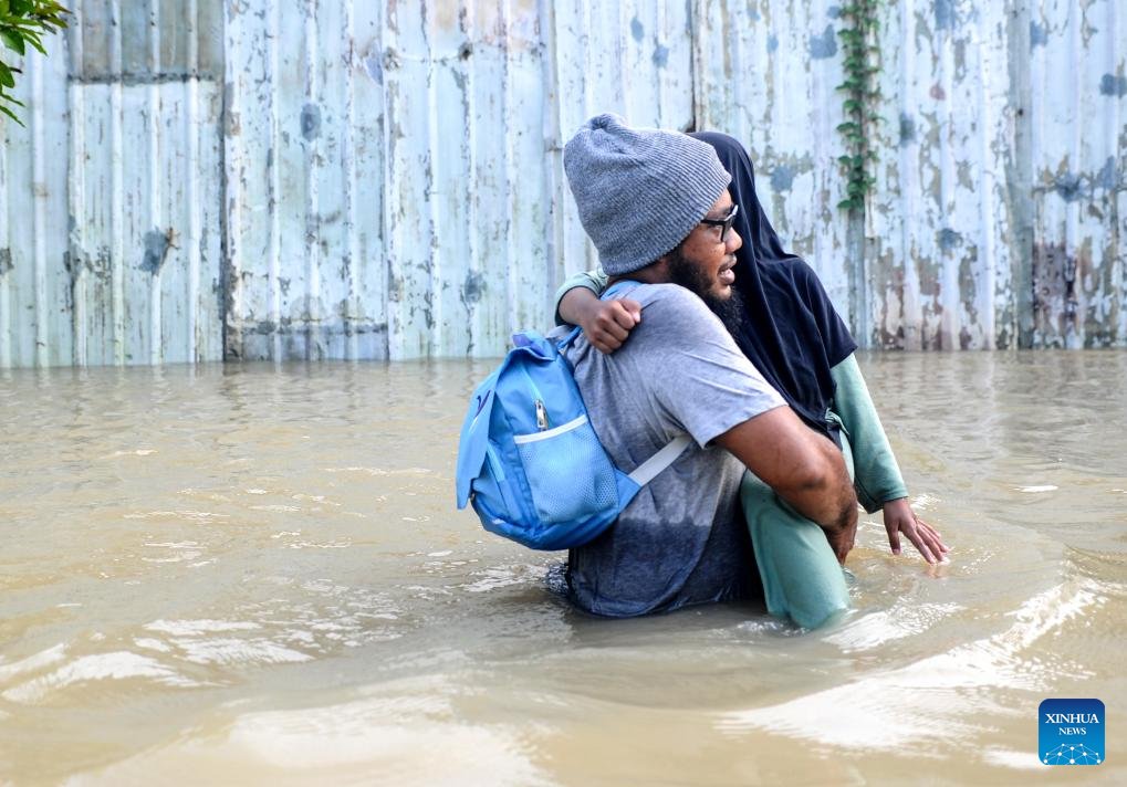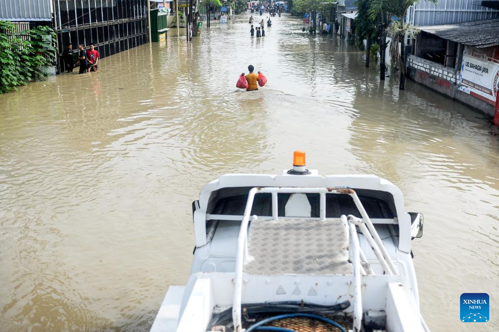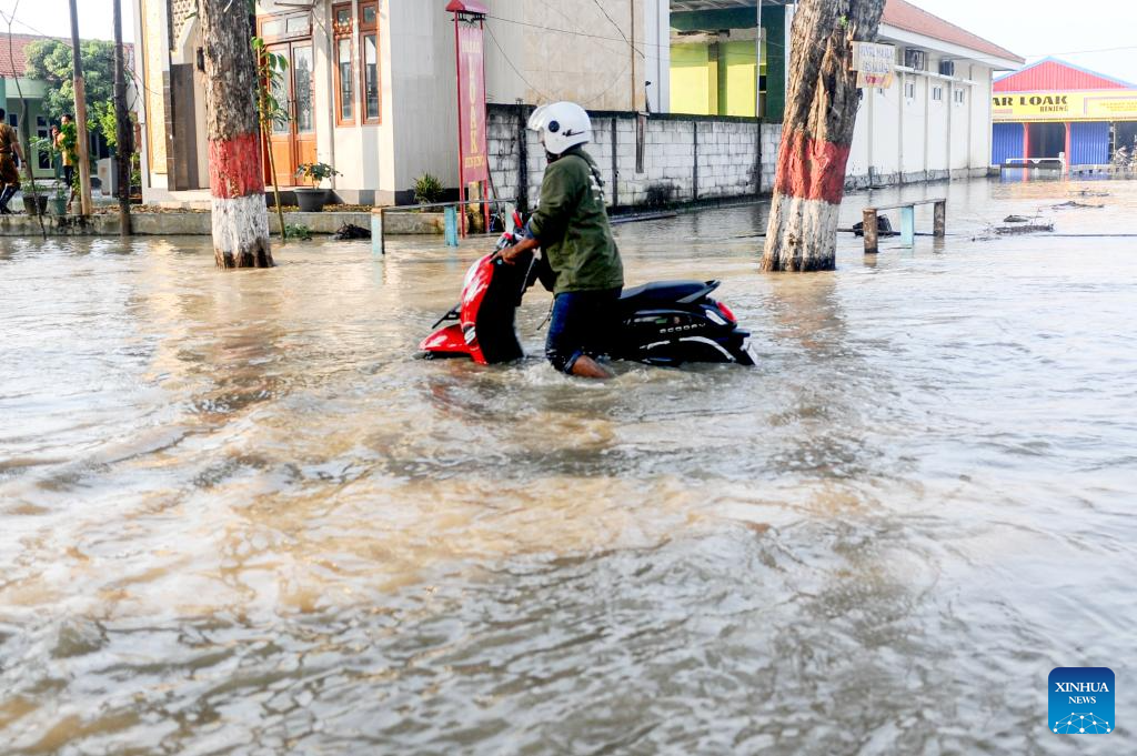 People wade through flood water after heavy rain in Benjeng village of Gresik Regency, East Java, Indonesia, June 10, 2025. (Photo by Sahlan Kurniawan/Xinhua)