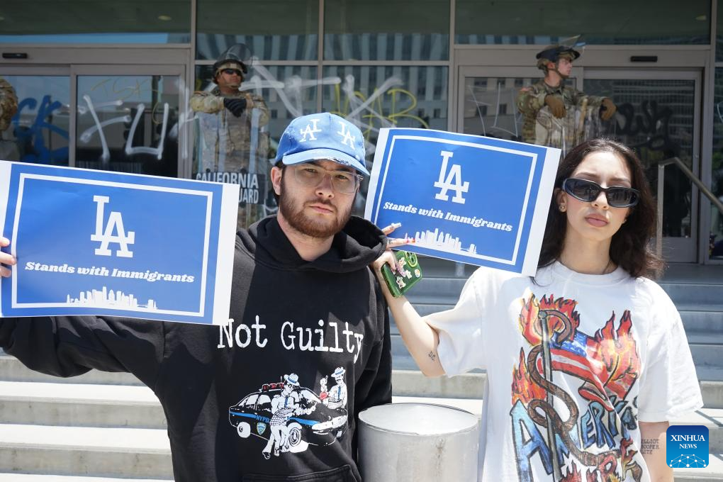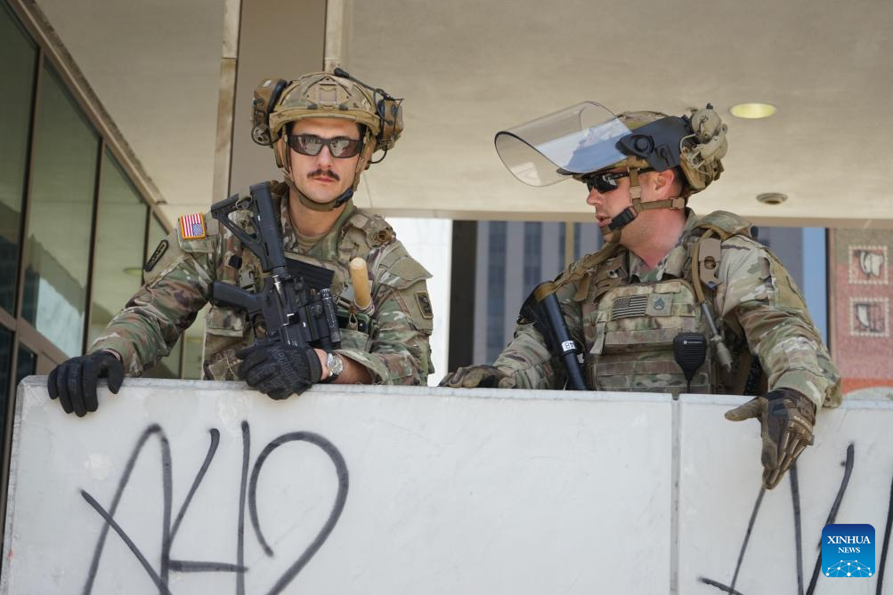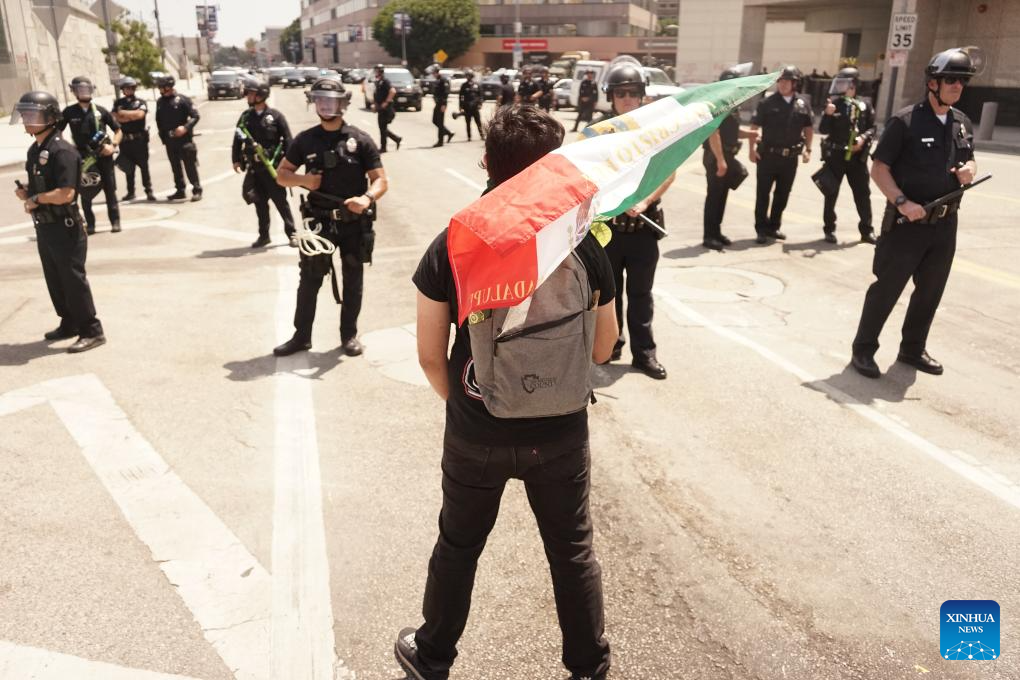 LOS ANGELES, June 10 (Xinhua) -- Thousands of U.S. troops and police were still surrounding small groups of peaceful protesters in downtown Los Angeles by Monday noon, following hours of confrontation. The unprecedented show of military force on American streets comes amid a constitutional crisis between the Trump administration and the state of California over immigration enforcement.