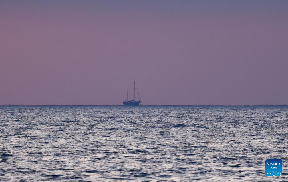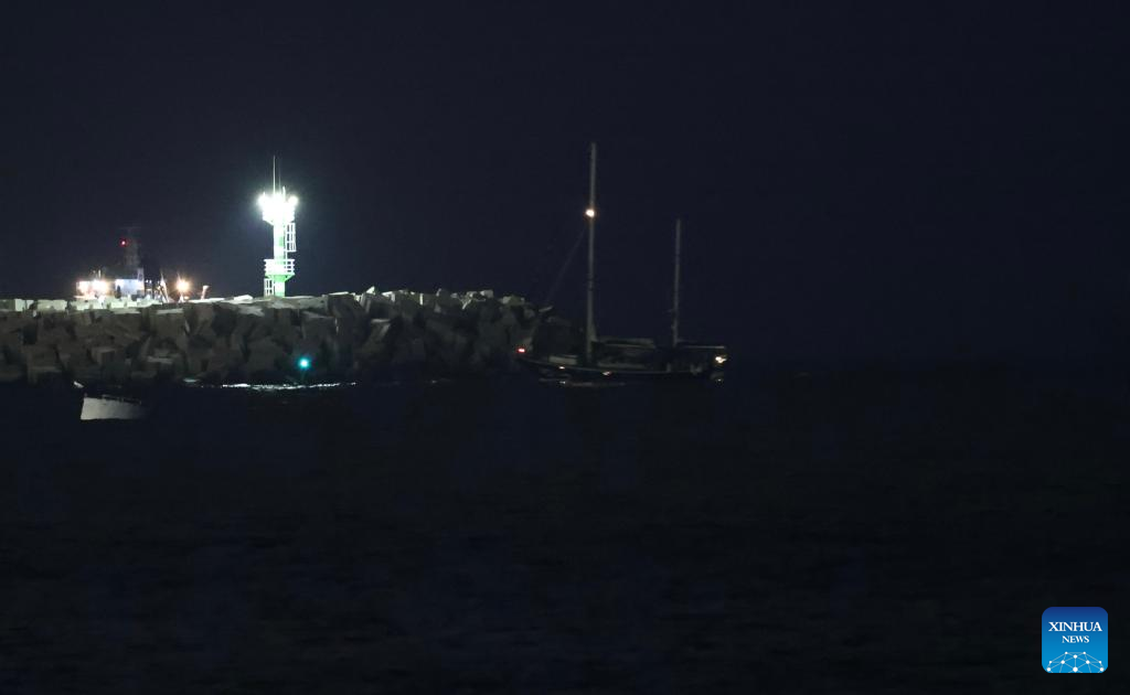 The vessel reportedly carrying humanitarian cargo arrives at the waters near the port of Ashdod, southern Israel, on June 9, 2025. Israel said on Monday it had intercepted a vessel carrying 12 activists attempting to breach its naval blockade of the Gaza Strip and escorted it to the port of Ashdod. (Photo by Jamal Awad/Xinhua)