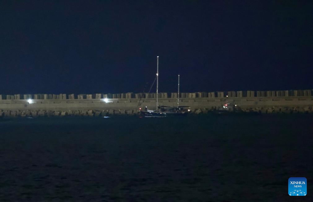 The vessel reportedly carrying humanitarian cargo arrives at the port of Ashdod, southern Israel, on June 9, 2025. Israel said on Monday it had intercepted a vessel carrying 12 activists attempting to breach its naval blockade of the Gaza Strip and escorted it to the port of Ashdod. (Photo by Jamal Awad/Xinhua)