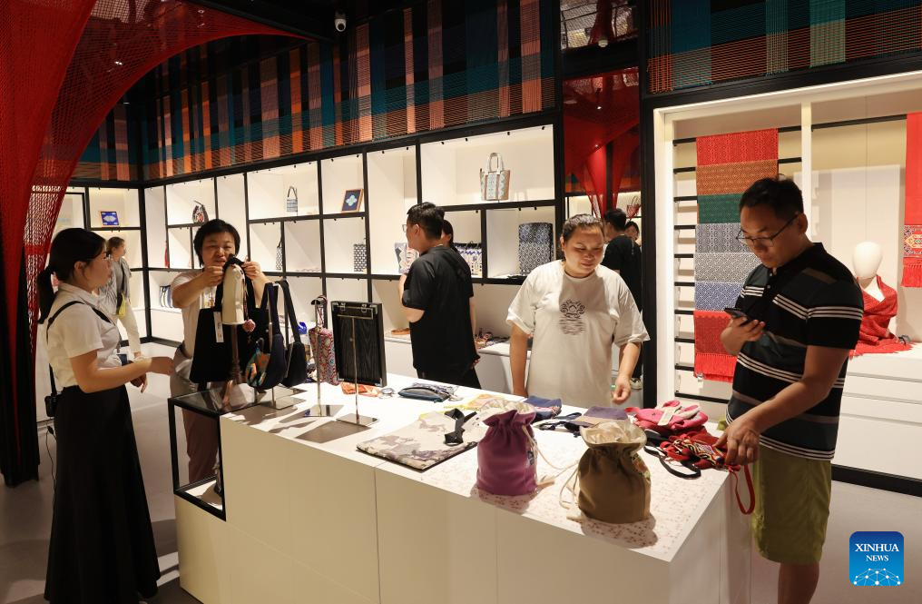 Tourists visit a cultural and creative park about Tujia ethnic tapestry in Zhangjiajie, central China's Hunan Province, June 9, 2025. As the Cultural and Natural Heritage Day is upcoming, Zhangjiajie City of Hunan Province has developed a touring route themed on intangible cultural heritage, so as to enrich local tourism while protecting and inheriting folk handicrafts. (Photo by Wu Yongbing/Xinhua)