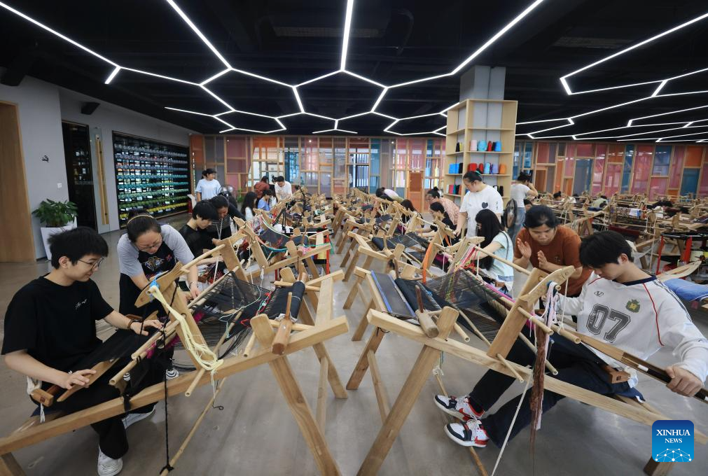 A college student (front) tries to weave Tujia ethnic tapestry during a study tour at a cultural and creative park in Zhangjiajie, central China's Hunan Province, June 9, 2025. As the Cultural and Natural Heritage Day is upcoming, Zhangjiajie City of Hunan Province has developed a touring route themed on intangible cultural heritage, so as to enrich local tourism while protecting and inheriting folk handicrafts. (Photo by Wu Yongbing/Xinhua)