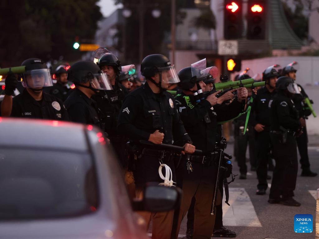 Policemen try to disperse people on the street when the curfew is effective in Los Angeles downtown area, California, the United States, on June 10, 2025. Los Angeles Mayor Karen Bass announced Tuesday evening that the second largest city in the United States has imposed a curfew in the downtown area from local time 8:00 p.m. (0300 GMT Wednesday) to 6:00 a.m. (1300 GMT) Wednesday. (Photo by Qiu Chen/Xinhua)