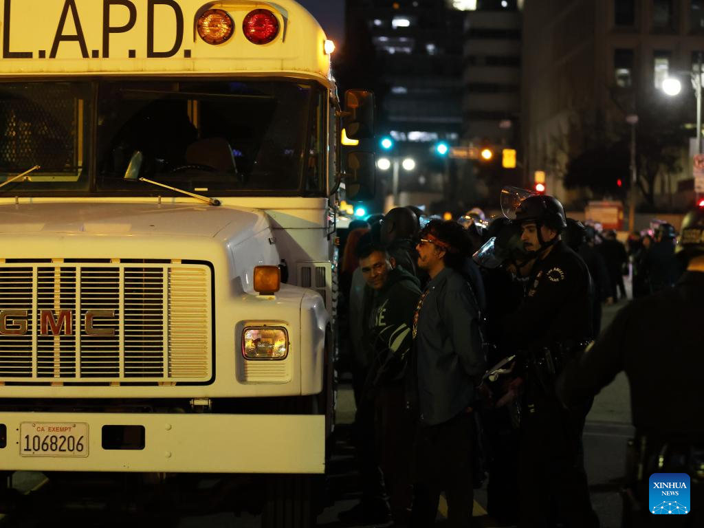 People are arrested by policemen as they do not leave the Los Angeles downtown area in time when the curfew is effective in Los Angeles, California, the United States, on June 10, 2025. Los Angeles Mayor Karen Bass announced Tuesday evening that the second largest city in the United States has imposed a curfew in the downtown area from local time 8:00 p.m. (0300 GMT Wednesday) to 6:00 a.m. (1300 GMT) Wednesday. (Photo by Qiu Chen/Xinhua)