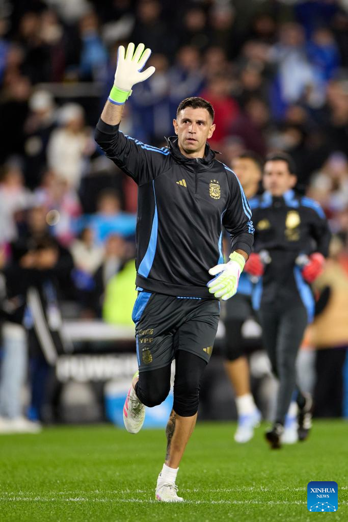 Argentina's goalkeeper Emiliano Martinez warms up before the 2026 FIFA World Cup CONMEBOL Qualifier football match between Argentina and Colombia in Buenos Aires, Argentina, June 10, 2025. (Xinhua/Meng Dingbo)
