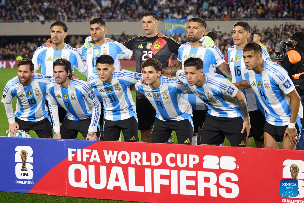 Argentina's starting lineup poses for a group photo prior to the 2026 FIFA World Cup CONMEBOL Qualifier football match between Argentina and Colombia in Buenos Aires, Argentina, June 10, 2025. (Xinhua/Meng Dingbo)