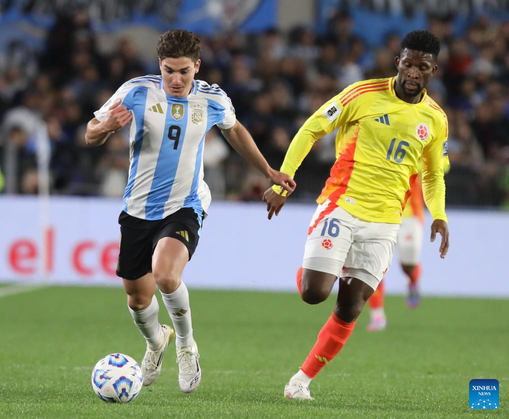 Julian Alvarez (R) of Argentina breaks through during the 2026 FIFA World Cup CONMEBOL Qualifier football match between Argentina and Colombia in Buenos Aires, Argentina, June 10, 2025. (Xinhua/Meng Dingbo)