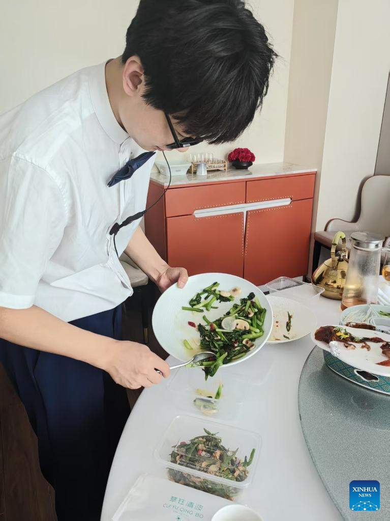 A staff member helps customers pack the leftover food at a restaurant in Xiqing District of north China's Tianjin, June 8, 2025. (Xinhua)