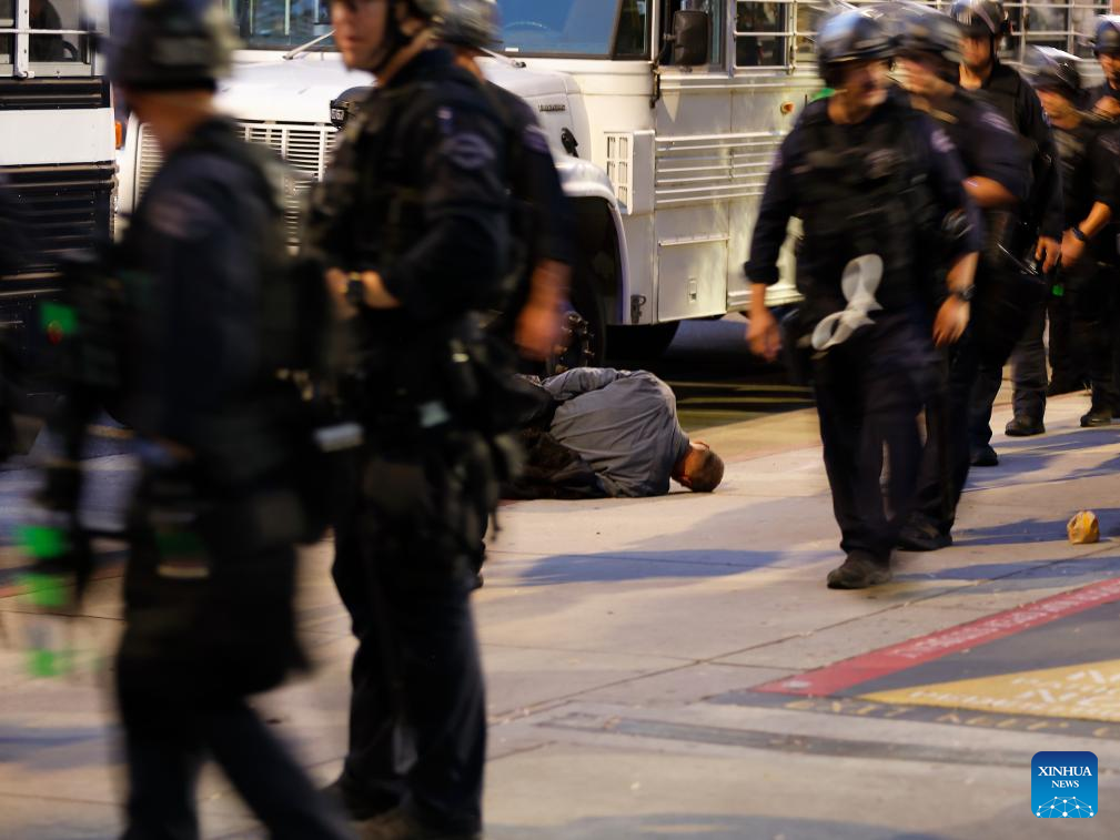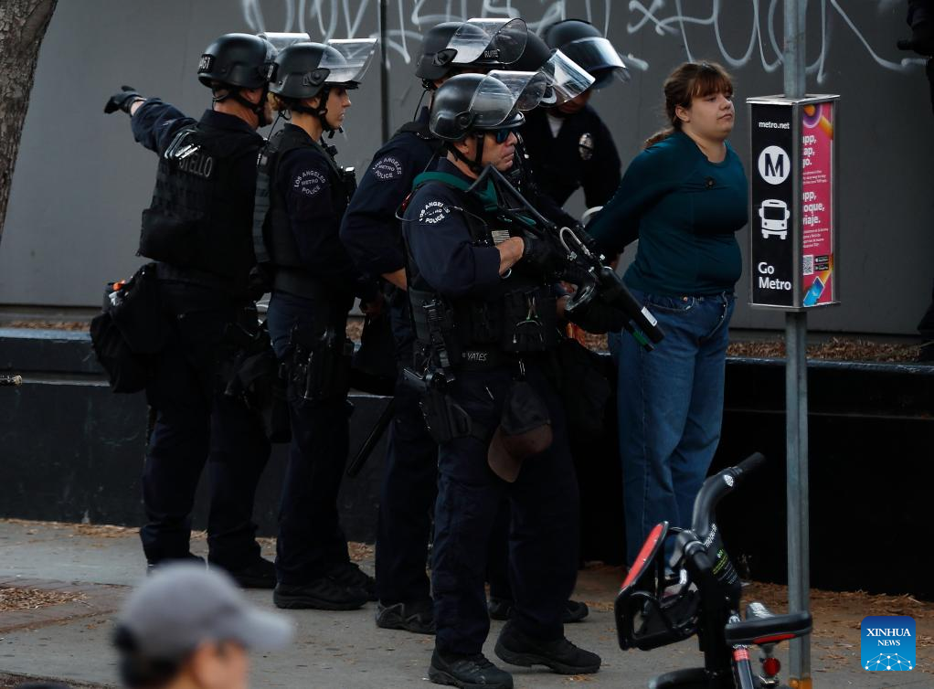 A protester is arrested in Los Angeles, the United States, June 11, 2025. Nearly 400 people in immigration protests have been arrested or detained by the Los Angeles Police Department since Saturday, media reports said.