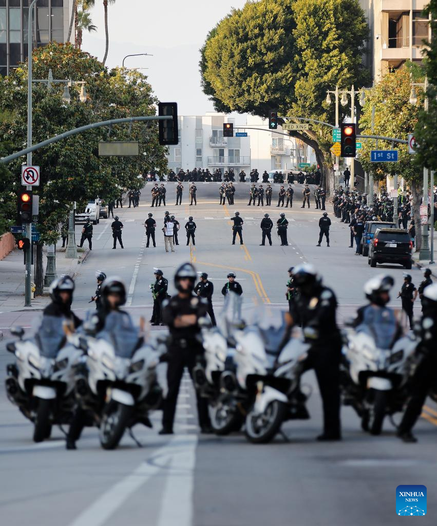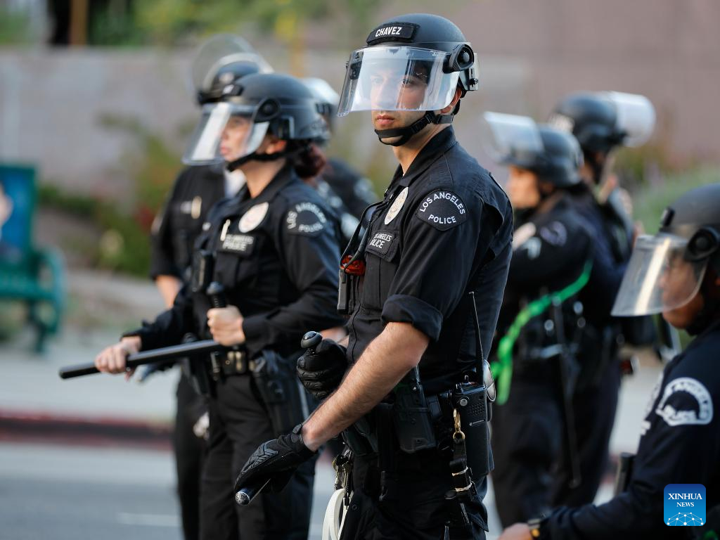 Police officers are on duty in Los Angeles, the United States, June 11, 2025. Nearly 400 people in immigration protests have been arrested or detained by the Los Angeles Police Department since Saturday, media reports said.