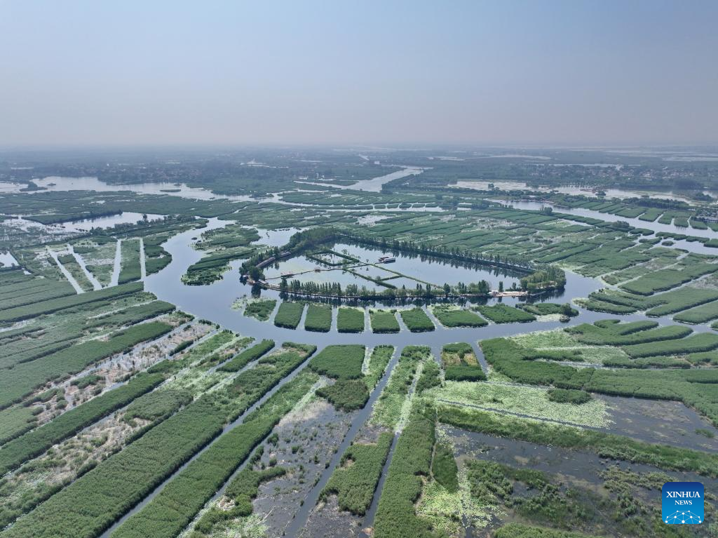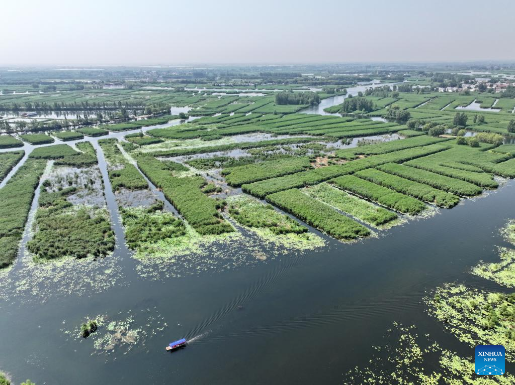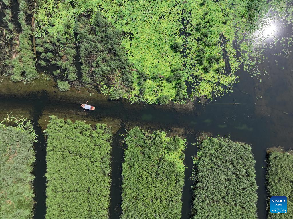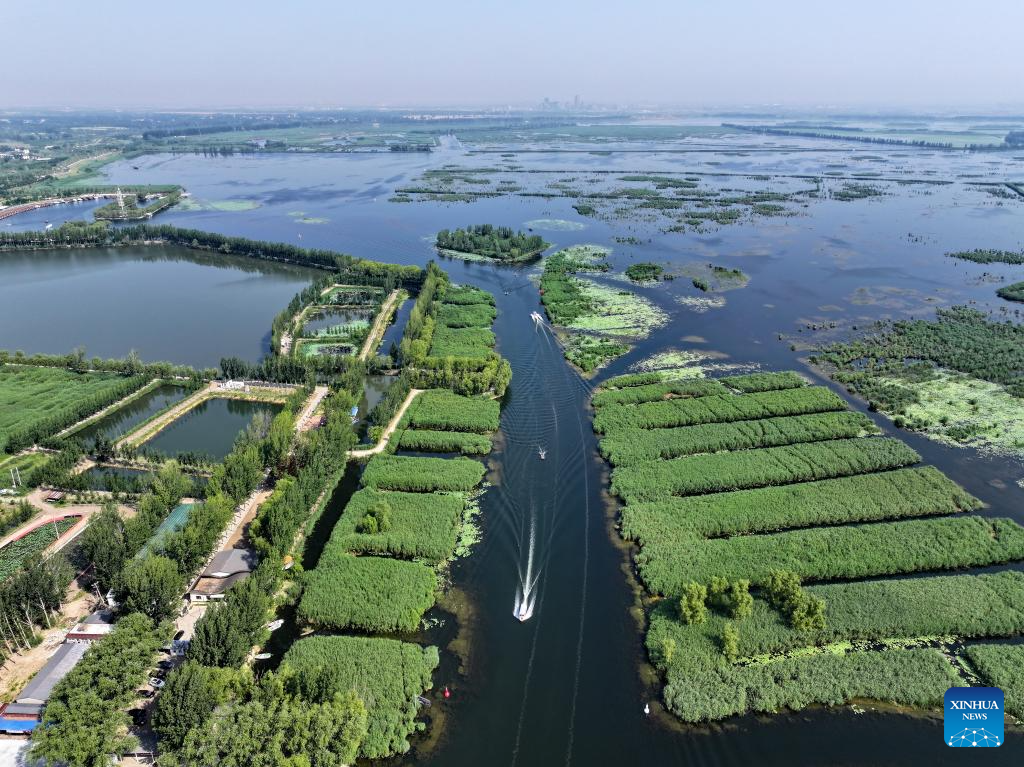 An aerial drone photo taken on June 11, 2025 shows a view of Baiyangdian Lake, Xiongan New Area of north China's Hebei Province. Since the founding of Xiongan New Area, the water quality of Baiyangdian Lake has been greatly improved thanks to the systematic ecological governance. (Xinhua/Mu Yu)