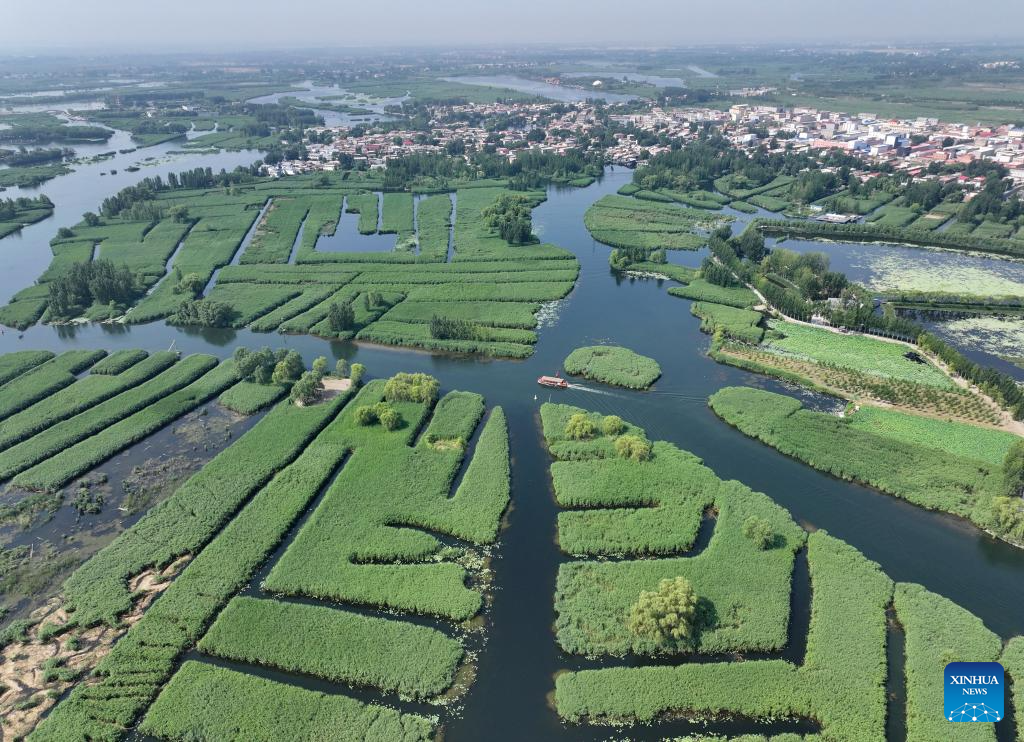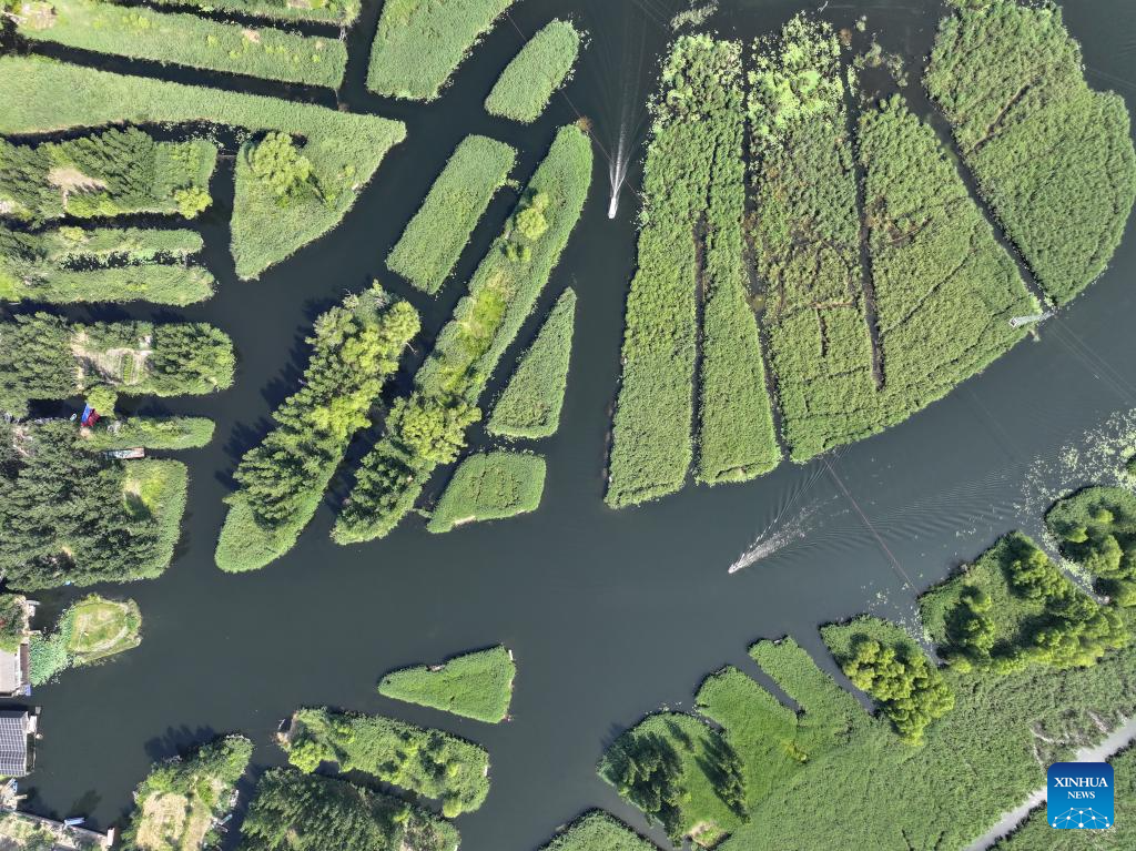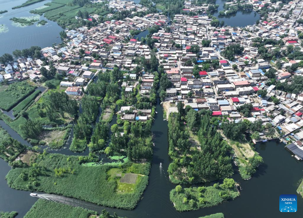 An aerial drone photo taken on June 11, 2025 shows villages in Baiyangdian area, Xiongan New Area of north China's Hebei Province. Since the founding of Xiongan New Area, the water quality of Baiyangdian Lake has been greatly improved thanks to the systematic ecological governance. (Xinhua/Mu Yu)