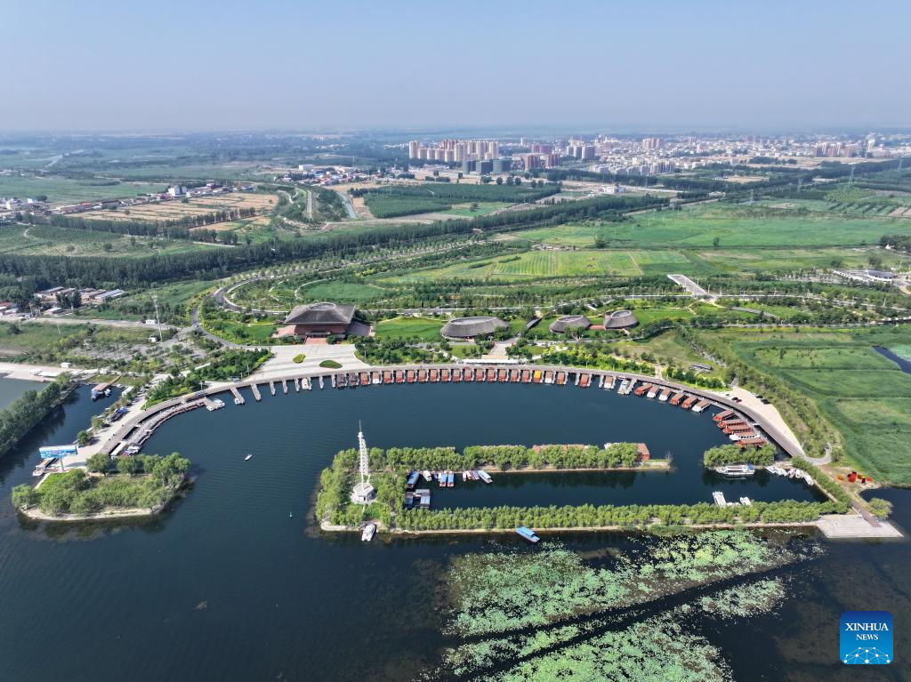 An aerial drone photo taken on June 11, 2025 shows the tourist dock of Baiyangdian Lake, Xiongan New Area of north China's Hebei Province. Since the founding of Xiongan New Area, the water quality of Baiyangdian Lake has been greatly improved thanks to the systematic ecological governance. (Xinhua/Mu Yu)