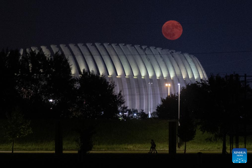 The moon is seen in the sky over the Arena Zagreb in Zagreb, Croatia, on June 11, 2025. (Davor Puklavec/PIXSELL via Xinhua)