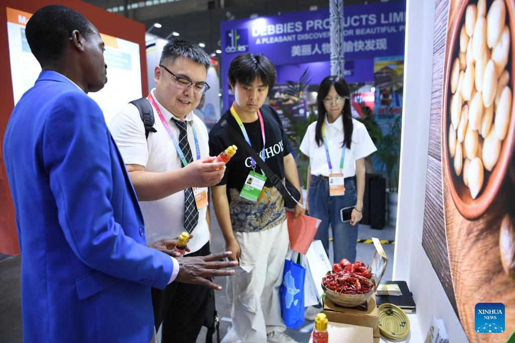 An exhibitor introduces chili pepper products from Rwanda at Changsha International Convention and Exhibition Center in Changsha, central China's Hunan Province, June 12, 2025. The fourth China-Africa Economic and Trade Expo opened on Thursday in the central Chinese city of Changsha.