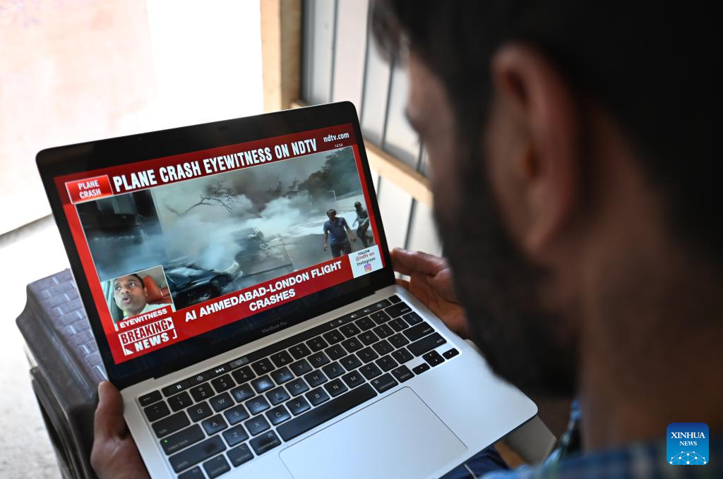 This photo taken in Srinagar, Indian-controlled Kashmir, shows a man watching the news of a plane crash in Ahmedabad of India's Gujarat state, June 12, 2025. An Air India flight to London crashed Thursday shortly after takeoff from an airport in the western Indian state of Gujarat, officials said. The flight with 242 people, including 230 passengers and 12 crew members, onboard took off from the Sardar Vallabhbhai Patel International Airport in Ahmedabad, about 17 km south of Gandhinagar, the capital city of Gujarat.(Xinhua/Javed Dar)