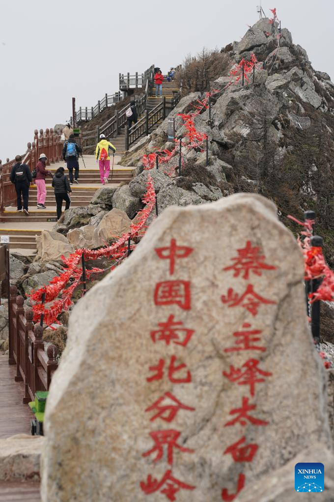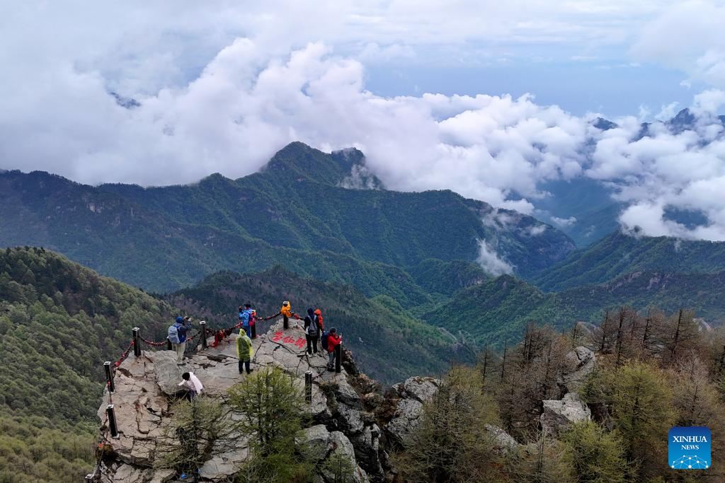 This photo taken on May 10, 2024 shows people visiting the Taibai Mountain scenic spot in Baoji City, northwest China's Shaanxi Province. Baoji, facing Qinling mountains in the south, loess terrace in the north, with Weihe River flowing through the city from west to east, has made great efforts in its ecological management and green development in recent years. (Xinhua/Shao Rui)