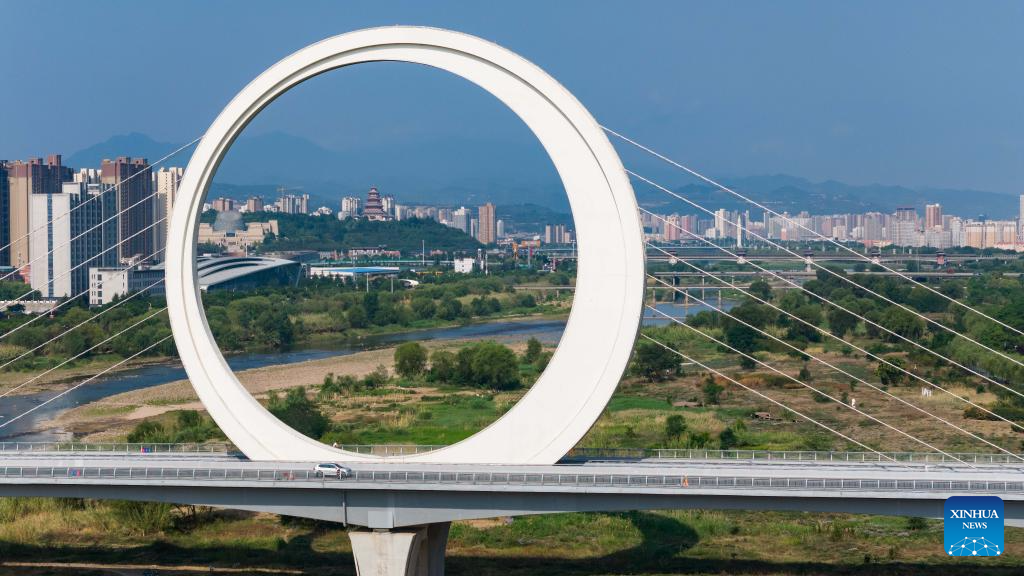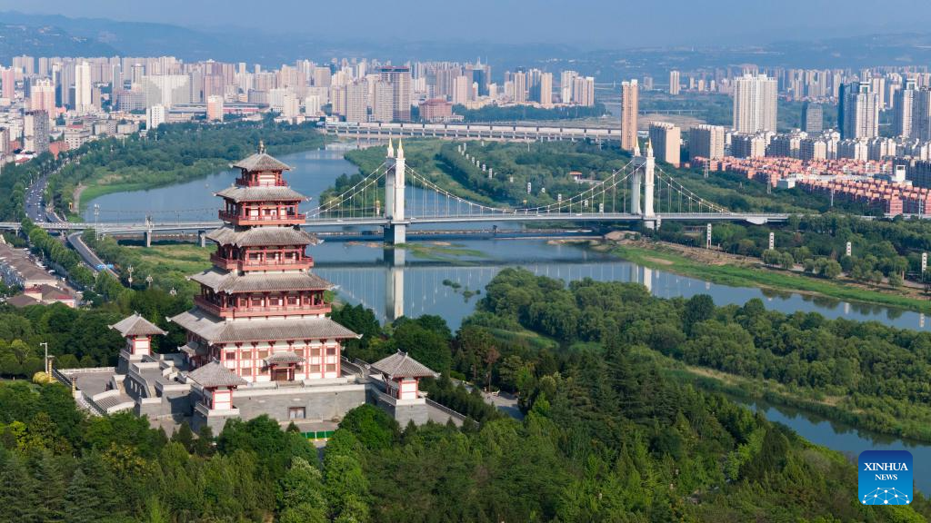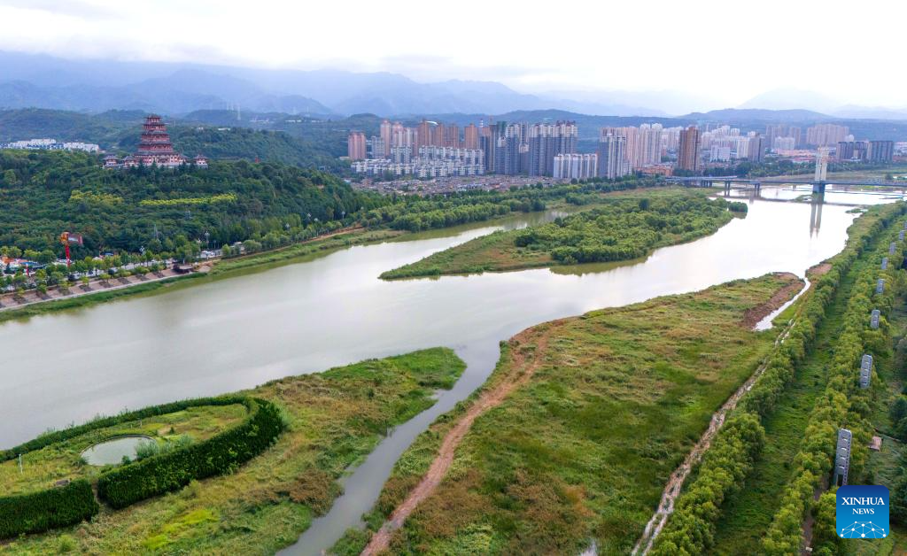 An aerial drone photo taken on Sept. 5, 2024 shows a view along Weihe River in Baoji City, northwest China's Shaanxi Province. Baoji, facing Qinling mountains in the south, loess terrace in the north, with Weihe River flowing through the city from west to east, has made great efforts in its ecological management and green development in recent years. (Xinhua/Zou Jingyi)