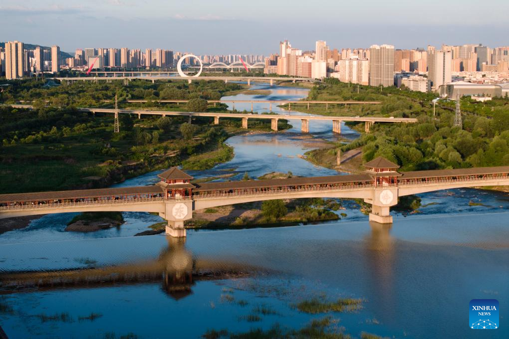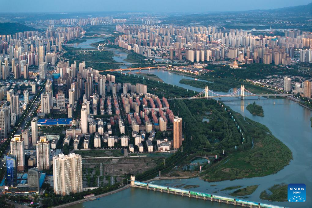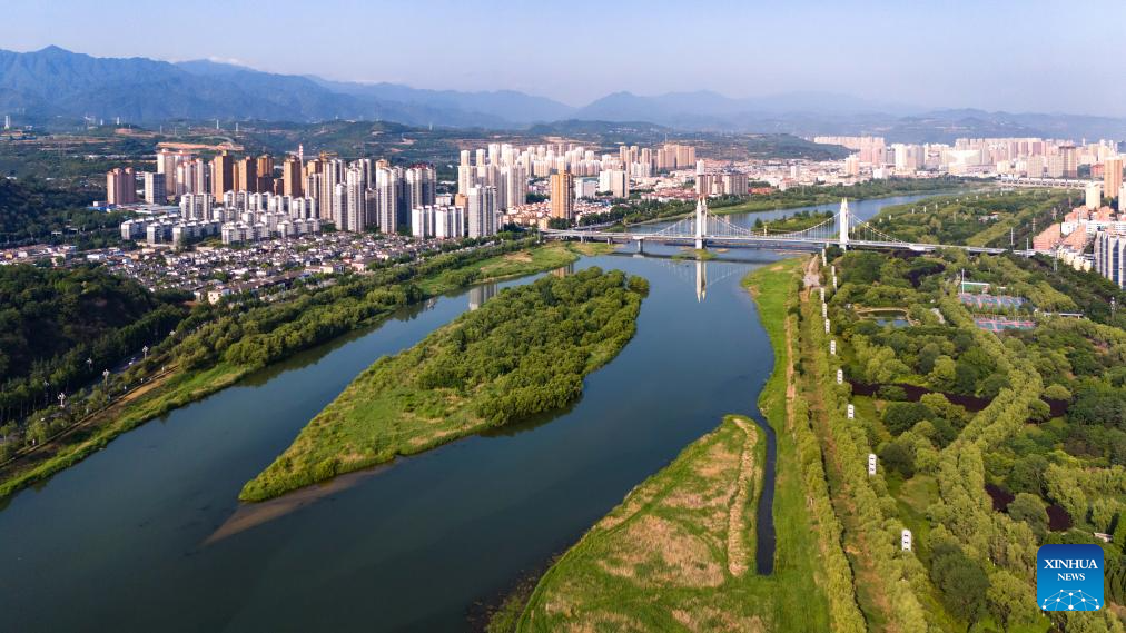 An aerial drone photo taken on May 28, 2025 shows a view along Weihe River in Baoji City, northwest China's Shaanxi Province. Baoji, facing Qinling mountains in the south, loess terrace in the north, with Weihe River flowing through the city from west to east, has made great efforts in its ecological management and green development in recent years. (Xinhua/Zou Jingyi)