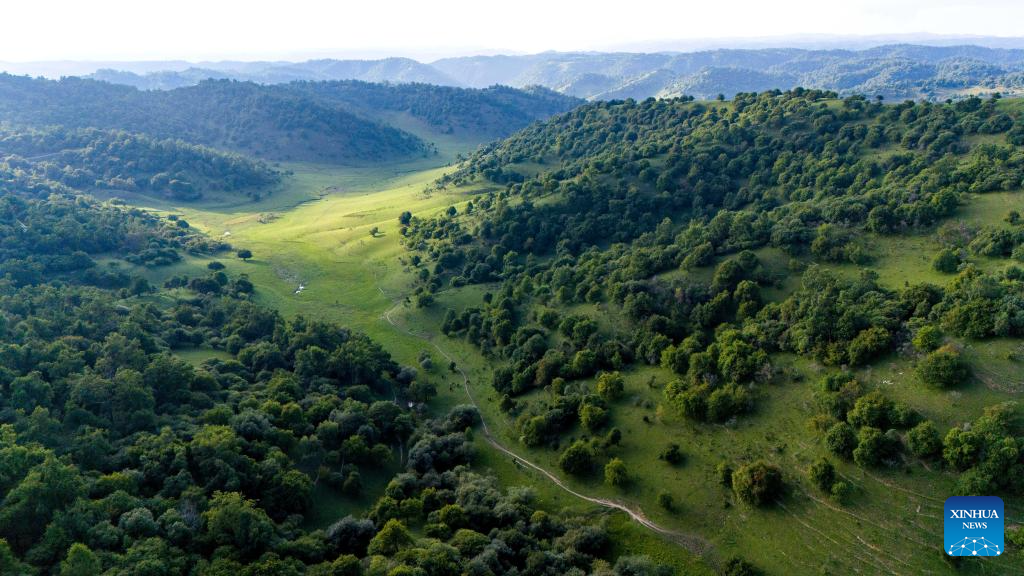 An aerial drone photo taken on Aug. 2, 2024 shows the Guanshan grassland scenic area in Longxian County of Baoji City, northwest China's Shaanxi Province. Baoji, facing Qinling mountains in the south, loess terrace in the north, with Weihe River flowing through the city from west to east, has made great efforts in its ecological management and green development in recent years. (Xinhua/Zou Jingyi)