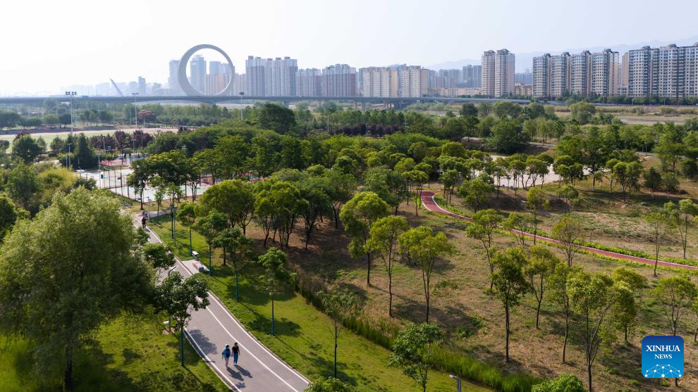 An aerial drone photo taken on May 9, 2024 shows a sports and leisure space built along the bank of Weihe River in Baoji City, northwest China's Shaanxi Province. Baoji, facing Qinling mountains in the south, loess terrace in the north, with Weihe River flowing through the city from west to east, has made great efforts in its ecological management and green development in recent years. (Xinhua/Shao Rui)