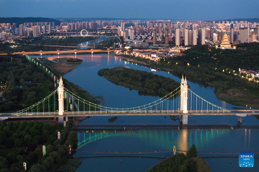 An aerial drone photo taken on May 9, 2024 shows a night view along Weihe River in Baoji City, northwest China's Shaanxi Province. Baoji, facing Qinling mountains in the south, loess terrace in the north, with Weihe River flowing through the city from west to east, has made great efforts in its ecological management and green development in recent years. (Xinhua/Shao Rui)