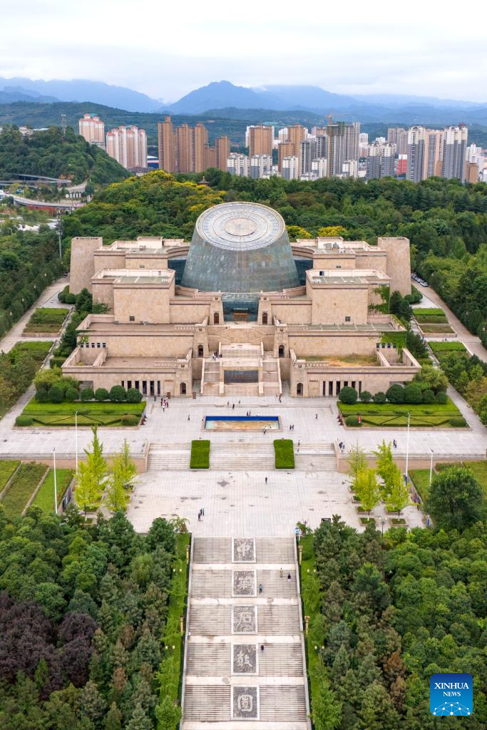 An aerial drone photo taken on Sept. 5, 2024 shows the Baoji Bronze Ware Museum in Baoji City, northwest China's Shaanxi Province. Baoji, facing Qinling mountains in the south, loess terrace in the north, with Weihe River flowing through the city from west to east, has made great efforts in its ecological management and green development in recent years. (Xinhua/Zou Jingyi)